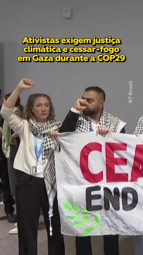 🏳️Manifestantes pedem fim da guerra em Gaza na COP29 A conferência climática da ONU em Baku, no Azerbaijão, teve uma manifestação de ativistas que carregavam faixas exigindo justiça climática e um cessar-fogo na Faixa de Gaza. #cop29 #Gaza #guerra #notícias #internacional