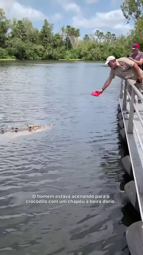 O homem provocou o crocodilo à beira do rio.
