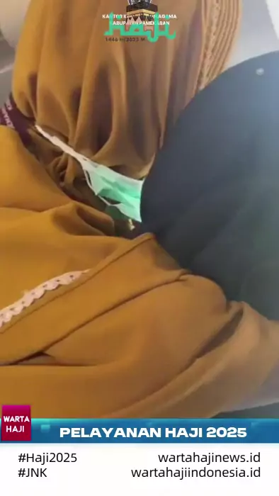 Penuh haru, pembimbing ibadah Haji Kloter SUB-28 menggendong Jamaah Haji wanita pengguna kursi roda saat turun dari pesawat #KemenagRI #Haji2025 #JNK #sorotan