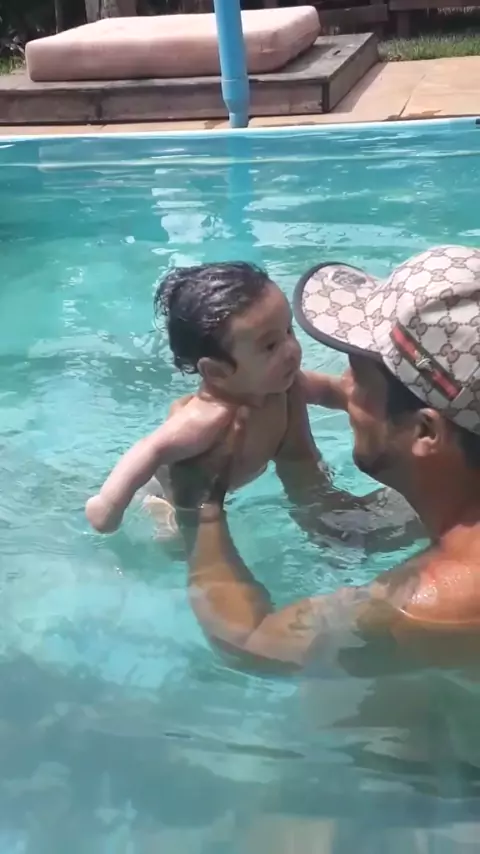 Primeira vez que nosso nenem entrou na piscina com papai! #saraydonato
