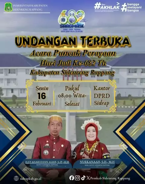 682 Tahun Kabupaten Sidenreng Rappang. UNDANGAN TERBUKA UNTUK SELURUH LAPISAN MASYARAKAT. Acara Puncak Perayaan Hari Jadi Ke-682 Kab. Sidrap 🗓️Senin, 16 Februari 2026 📍Kantor DPRD Kab. Sidrap #saromasesidenrengrappang #682tahunsidrap #bupatisidrap #syaharuddinalrif #harijadisidrap More