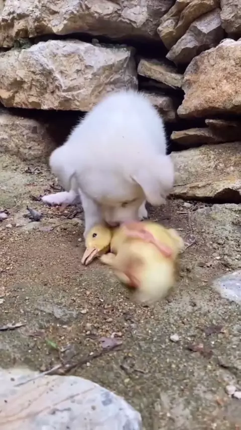 O cão guarda o pequeno pato.