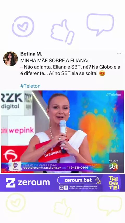 Durante a exibição do Teleton 2025, um comentário feito por uma internauta viralizou ao resumir o sentimento de muitos fãs sobre a presença de Eliana na atração beneficente. A apresentadora, madrinha do projeto, participou pela primeira vez desde que deixou o SBT e assinou com a Globo. “Minha mãe sobre a Eliana: não adianta. Eliana é SBT, né? Na Globo ela é diferente… Aí no SBT ela se solta!”, escreveu a usuária nas redes. O comentário rapidamente ganhou força entre internautas que destacaram a