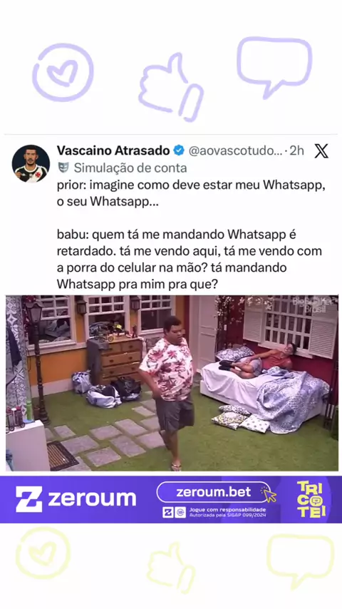 Internautas resgatam diálogo icônico entre Prior e Babu no BBB 20. Eles tentavam imaginar a quantidade de mensagens chegando no WhatsApp enquanto ainda estavam na casa: prior: imagine como deve estar meu Whatsapp, o seu Whatsapp... babu: quem tá me mandando Whatsapp é retardado. tá me vendo aqui, tá me vendo com a p0rr4 do celular na mão? tá mandando Whatsapp pra mim pra que? 📽️ Imagem/Reprodução | TV Globo