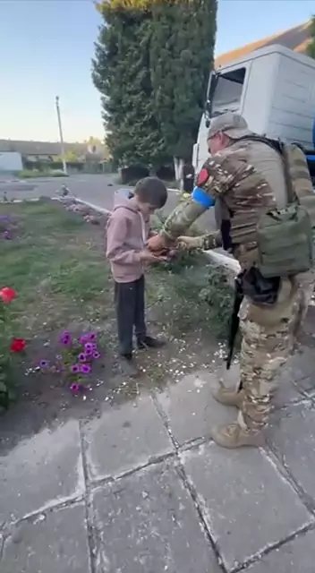 ⚡️Nosso Guerreiro ucraniano🇺🇦✊🏻 dá comida e doces a uma criança na região de Kursk. Perto dali, os moradores coletam água que os ucranianos levaram aos habitantes locais E lembre-se do que os russos fizeram quando capturaram cidades ucranianas A Ucrânia não é a Rússia. O povo ucraniano é muito diferente do povo russo. Em Kurshchyna, soldados ucranianos deram doces às crianças e levaram carros com água aos habitantes locais. Confirmação mais uma vez de que a Ucrânia não é a Rússia.