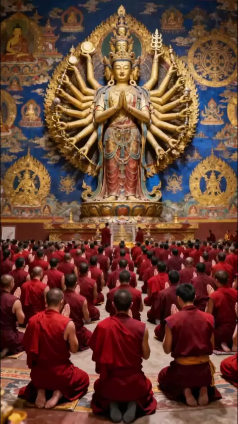 Magnificent Thousand-Hand Guanyin & monks in prayer. The Tibetan thangka is stunning! 🕊️ #thangka #fyp #blessed
