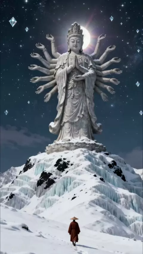 Above the snow-capped peak, the Thousand-Handed Guanyin is bathed in the soft light of the crescent moon and stars. A monk with fluttering robes walks slowly toward the Buddha's light. #BuddhistVibe #DigitalArt #HealingLandscape