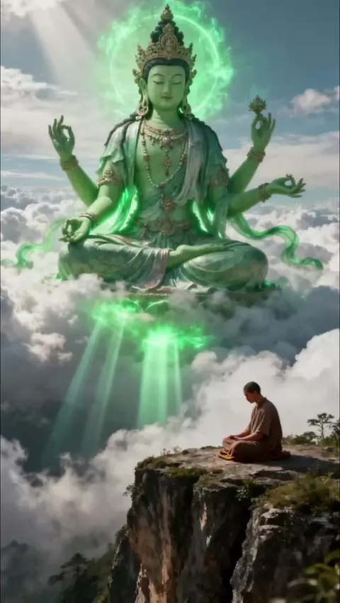 When the giant Green Tara emerges from the sea of clouds and holy light pours down, the meditator on the cliff resonates with the divine… This scene instantly calms the heart, as if wrapped in compassionate energy #fyp