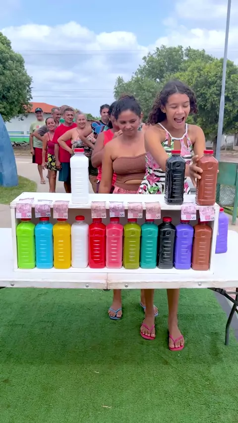 Jogo da garrafa colorida: acerte a garrafa da mesma cor e ganhe dinheiro.