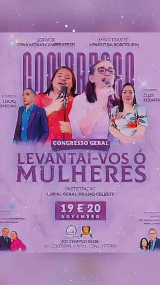 Bom dia queridos do kwai! Vêm aí o nosso Congresso Geral: LEVANTAI-VOS ó MULHERES! Dias 19 e 20 de Novembro🙌 Preletora: missionária Aparecida Borges de Mossoró Rio Grande do Norte Cantores: Edna Morais Lucas Matias, Ellis Serafim. Participações especiais: Coral Geral Brilho Celeste, Exército de Déboras, Grupo de Mirian, Banda Adonai e vocal Águias de Deus🥰Será uma benção pra glória de Deus🙏