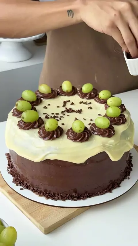 Bolo bombom de uva 馃崌 Ingredientes Massa: 4 ovos grandes (200 g) 300 g de a莽煤car refinado 165 g de 贸leo vegetal 245 g de leite integral 240 g de farinha de trigo 60 g de cacau em p贸 50% 15 g (1 c.sopa) fermento qu铆mico Pitada de sal recheio 4cx de leite condensado 6 cx de creme de leite +\- 700g de uvas verdes sem semente #confeitaria #receitas #confeitariaartesanal #receitasfaceis #bolobombom