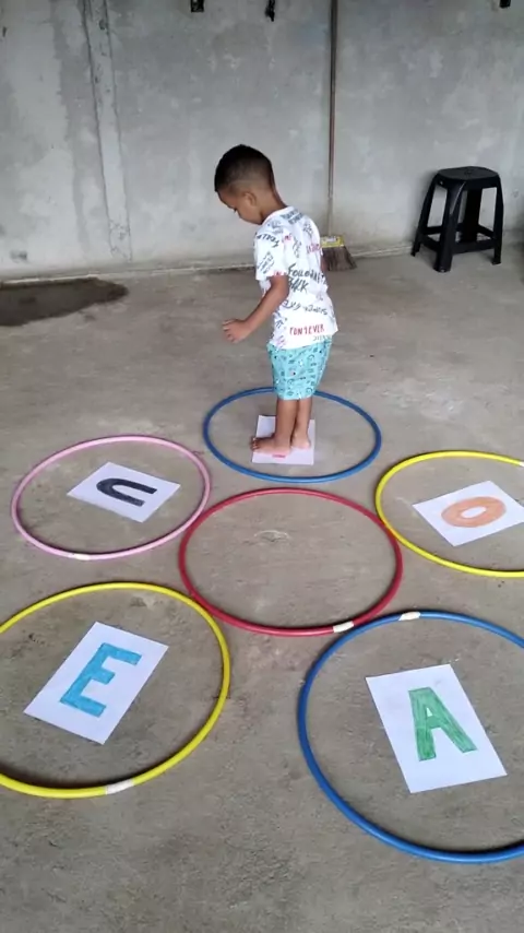 Brincadeira Trabalhando as vogais e coordenação motora. A criança deve seguir o comando da professora pulando nas letrinhas pedidas. #educacaoinfantil #letras #aprender #brincando #amor