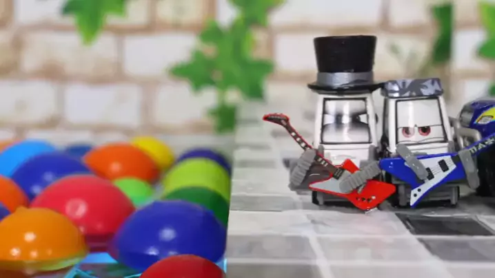 O menino gosta do jogo de carros de corrida dos desenhos animados e mini carros taxiando na água na pista colorida.
