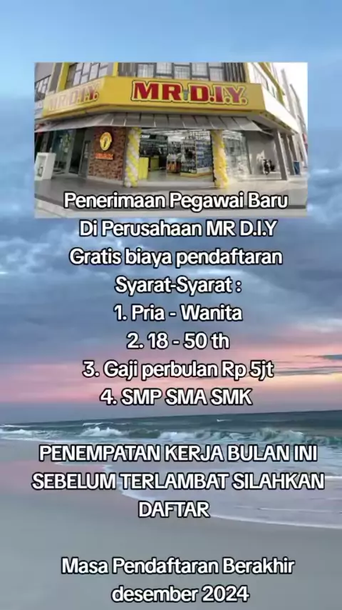 Penerimaan Pegawai Baru Di Perusahaan MR D.I.Y Gratis biaya pendaftaran Syarat-Syarat : 1. Pria - Wanita 2. 18 - 50 th 3. Gaji perbulan Rp 5jt 4. SMP SMA SMK PENEMPATAN KERJA BULAN INI SEBELUM TERLAMBAT SILAHKAN DAFTAR Masa Pendaftaran Berakhir desember 2024#loker#infoloker#mrdiy#indonesia#sorotan#indonesiaviral#indonesia#viral#indonesia#viral