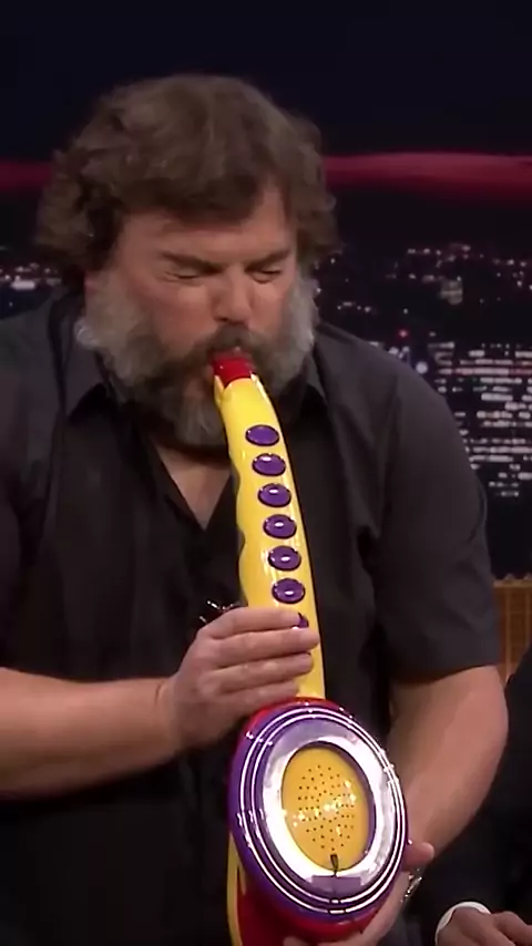 "Jack Black performs his legendary Sax-A-Boom!" . "Jack Black apresenta o seu lendário Sax-A-Boom!".