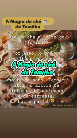 Bom dia! Benefícios do óleo essencial de "Tomilho" O óleo essencial de tomilho é um verdadeiro “mágico”. Afinal, ele ajuda em vários tratamentos de resfriados e também inflamações na garganta. Ideal para tratar amigdalites, laringite, faringite, bronquite e outros. Uso do chá a noite de "Tomilho" Por isso, o chá de tomilho é recomendado antes da hora de dormir, ajudando a garantir uma melhor noite de sono. Também atua no alívio de sintomas da ansiedade e do estresse. Luz e paz!