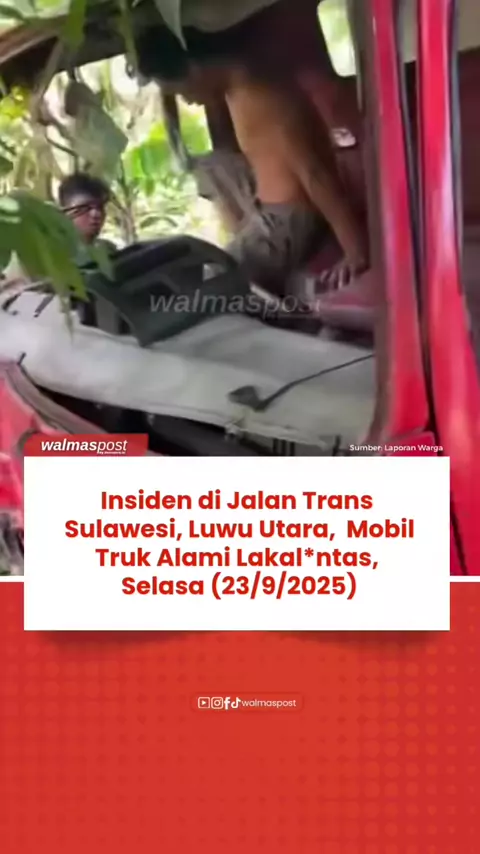 Sebuah insiden lalu lintas terjadi di Jalan Trans Sulawesi tepatnya di Desa Mari-Mari, Kecamatan Sabbang Selatan, Kabupaten Luwu Utara, Selasa (23/9/2025) sekitar pukul 12.09 WITA. Menurut laporan warga, sebuah truk berwarna merah yang keluar dari lorong diduga disambar oleh mobil lain yang melintas di jalur Trans Sulawesi. Usai menyambar, kendaraan tersebut langsung kabur meninggalkan lokasi. Beruntung, korban dalam peristiwa ini dilaporkan dalam keadaan baik.#walmaspost
