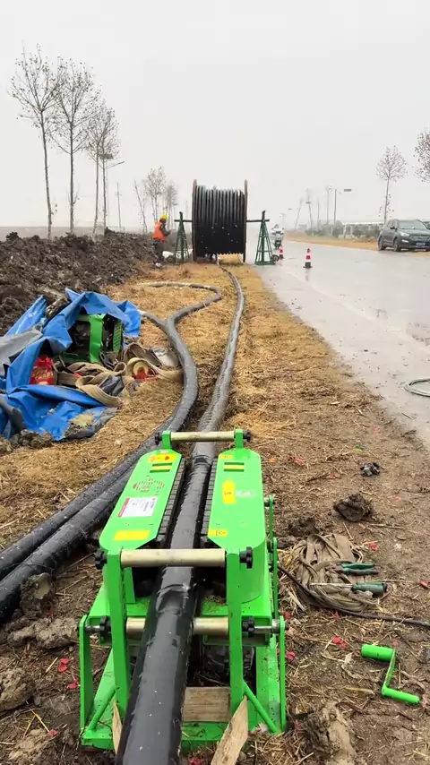The cold weather can't stop the determination to pull the cable. #cableconveyor #cablepulling #sourcefactory #cablelayinginnovation