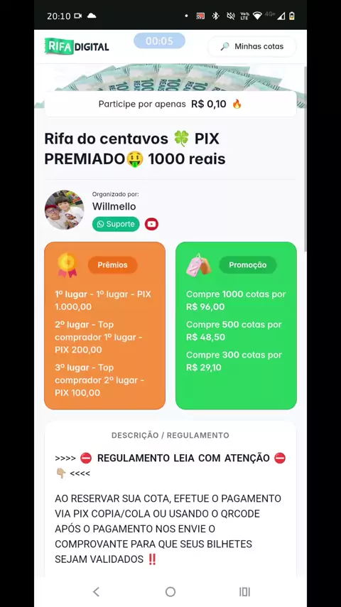 Estou fazendo uma campanha Rifa do centavos 🍀 PIX PREMIADO🤑 1000 reais, e cada cota está custando R$ 0,10. O link da minha campanha é este https://rifa.digital/s/rifa-do-centavospix-premiado-1000-reais418141