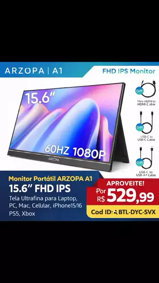 Monitor Portátil ARZOPA A1 15.6" FHD IPS, Tela Ultrafina para Laptop, PC, Mac, Celular, iPhone15/16, PS5, Xbox por R$529,99 Cód ID 🔍 BTL-DYC-SVX LINK 🔗 FIXADO NOS COMENTÁRIOS