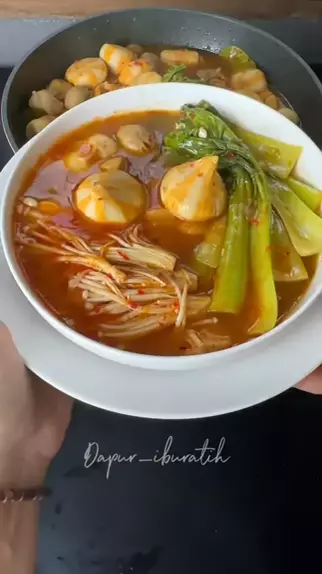 Steamboat Kuah Tomyang Bahan-bahan Isian Steamboat - pakcoy - Jamur enoki - Frozen Food - Udang secukupnya Bahan kuah - 10 cabai merah - 5 siung bawang putih - Kepala udang secukupnya - 8 lebar daun jeruk - 2 batang serai - 1 ruas lengkuas - 1 ruas jahe - 2 buah jeruk nipis - 1,5 liter air - Garam - Kaldu bubuk - Lada bubuk - Gula pasir - Pasta tomyam ( opsional ) Cara membuat lihat di vidio Selamat Mencoba π #steamboatkuahtomyam #tahunbaru #menutahubaru #tomyam #kuahtom