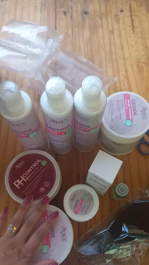 linha cachos da ápice, shampoo, condicionador, idratante, anti porosidade e blend de óleos.