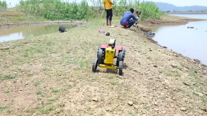 Anak kecil itu menyukai permainan interaktif penyelamatan yang menarik dari traktor, mobil rekayasa mainan dan truk besar di tepi danau.