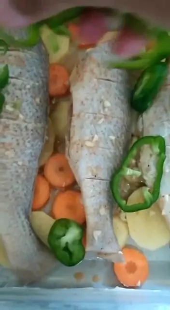 Corvina assada, com 🥔 e 🥕 #Receita 1kg de corvina média 3 dentes de alho 5 batatas 1 cenoura 1 cebola 1tomate 1pimentão sal, shoyu, curry e páprica a gosto 1/2 limão Faça pequenos cortes na lateral dos peixes, tempere com alho, sal, shoyu, limão, páprica e curry a gosto, e deixe descansar por 30min. Unte a forma com manteiga e cubra com rodelas de 🥔 e 🥕, coloque os 🐟🐠 e cubra com 🍅, 🧅 e pimentão. Leve ao forno por cerca de 40min #NoChurrasco #culinaria #cozinha #receitas