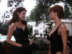 Victoria Principal as Pamela Barnes Ewing in Dallas episode 143: Barbecue Four december 1983, black swimsuit
