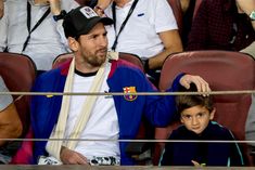 The injured player of FC Barcelona Leo Messi, observes with his son...