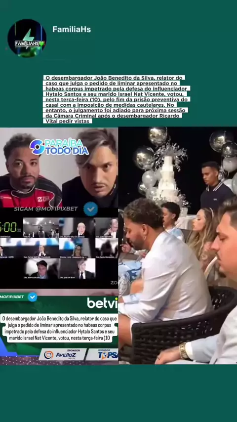 O desembargador João Benedito da Silva, relator do caso que julga o pedido de liminar apresentado no habeas corpus impetrado pela defesa do influenciador Hytalo Santos e seu marido Israel Nat Vicente, votou, nesta terça-feira (10), pelo fim da prisão preventiva do casal com a imposição de medidas cautelares. No entanto, o julgamento foi adiado para próxima sessão da Câmara Criminal após o desembargador Ricardo Vital pedir vistas #CarnaKwai