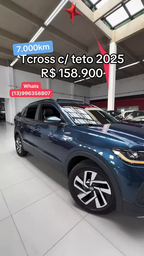 R$ 158.900 – VolksWagen T-Cross Comfortline 200 TSI Automático 2025 🟢 Quilometragem: 7.000 km 🟢 Ano/Modelo: 2025 🟢 Cor: Azul 🟢 Câmbio: Automático 6 marchas 🟢 Versão: Comfortline 200 TSI com teto Opcionais: ✅ Teto solar panorâmico ✅ Central multimídia VW Play com Android Auto e Apple CarPlay ✅ Rodas de liga leve ✅ Ar-condicionado digital ✅ Controle de tração e estabilidade ✅ Assistente de partida em rampa ✅ Sensores de estacionamento dianteiro e traseiro ✅ Direção elétrica progressiva ✅ C