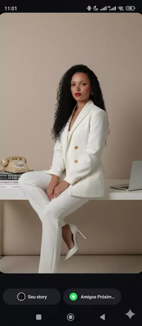 #GEMINI Crie uma fotografia editorial fotorrealista de alta qualidade, estilo minimalista e sofisticado. O rosto deve ser exatamente o da pessoa da foto fornecida (usar a imagem anexada como referência para preservar traços faciais, proporções, idade aparente, tom de pele e corte de cabelo). Não alterar o rosto nem o cabelo original. A cena deve seguir o estilo da referência: ambiente minimalista, com fundo neutro em tom claro. A modelo deve estar sentada sobre uma mesa branca, per