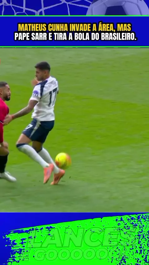 Matheus Cunha invade a área, mas Pape Sarr e tira a bola do brasileiro.#Tottenham #manchesterunited #TottenhamxManchesterUnited #PremierLeague #esporte