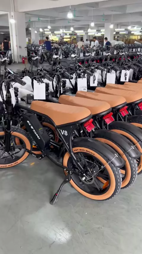 Nova bicicleta elétrica V8 com assento marrom e pneus. # ebike # ebicycle # ebikefactory # fatbike # citybike # mountainbike # OEM # ODM # masscustomization # ebikemanufacturer # production # electricbike # electricbicycle # originalfactory # bulkproduction # ebike # fattireebike # bulking