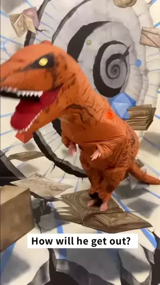 Where is this t-Rex is on his way to in such a rush? #trex #inflatable #halloween #halloweencostume