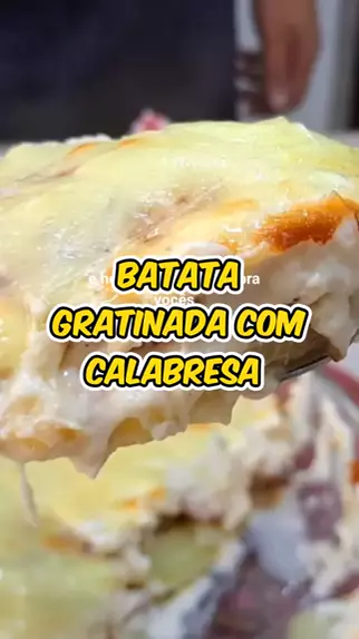BATATA GRATINADA COM CALABRESA Ingredientes: 6 batatas médias (600 g) 2 gomos de linguiça calabresa (400 g) 1 fio de azeite 1 cebola (120 g) 2 colheres de manteiga (40 g) 3 colheres de farinha de trigo (45 g) 500 ml de leite 1 caixinha de creme de leite (200 g) sal a gosto pimenta do reino a gosto noz-moscada a gosto água quente para o cozimento capacidade da xícara é de 240 ml peso é o total dos ingredientes
