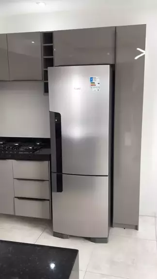 Cozinha entregue na cor lacca fumé, com puxador facetado, com local pra colocar microondas, sugar e geladeira. 🫶🏻🙌🏻 #mdf #marcenaria #cozinha #projetados