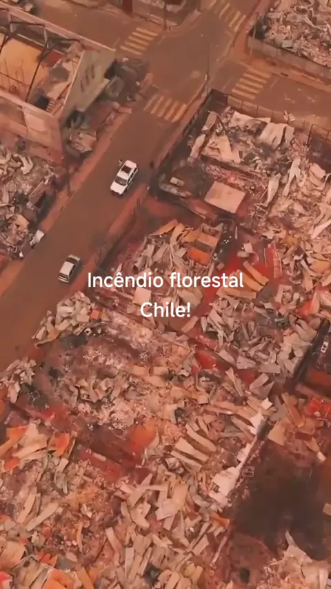 Devastação capturada em vídeo após um incêndio florestal catastrófico em Punta de Parra, perto de Tomé, Região de Biobío, Chile.