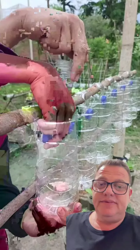 Se liga aí, pessoal! 💡🌱 Ideia simples e genial: com garrafas PET de água mineral, dá pra montar uma horta suspensa incrível! O cara corta a garrafa, faz furinhos pra drenagem, reaproveita a própria boca e tampa pra fixar e prende tudo em madeira ou cabo de vassoura. Resultado? Várias hortaliças em pouco espaço, de forma sustentável e econômica. Bora colocar a mão na massa! #SeLigaAíPessoal #Sustentabilidade #HortaEmCasa #Reaproveitamento #FaçaVocêMesmo