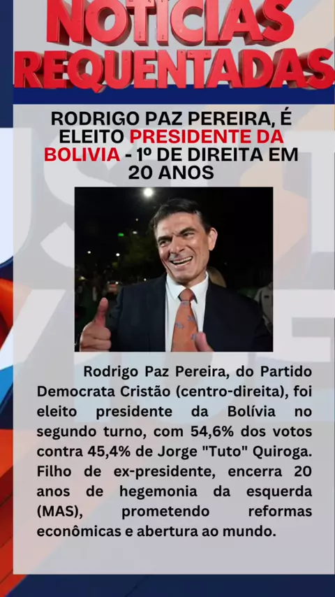 Depois de quase 20 anos de hegemonia da esquerda, Bolívia elege Rodrigo Paz Pereira como presidente. Filho de ex-chefe de Estado e líder do PDC, ele promete reformas e abertura internacional. Você acredita que esse é o começo de uma nova era para o país? 🇧🇴✨ #Bolívia #RodrigoPaz #PolíticaLatina #Eleição2025 #NovoCapítulo