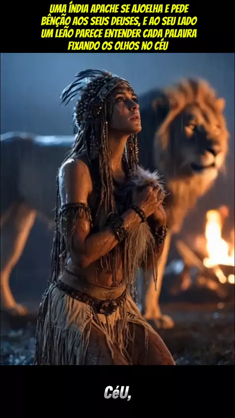 Inacreditável! Um momento de conexão entre homem e natureza! Assista. Uma índia Apache se ajoelha e pede bênção aos seus deuses, e ao seu lado, um leão parece entender cada palavra, fixando os olhos no céu, como se compartilhando da mesma fé. Ela suplica por proteção, força e muitas bênçãos, pois os inimigos já estão se aproximando, e o perigo ameaça a sua aldeia. O leão, firme e atento, permanece ao lado dela.. #educação #foryou #ia #viraliza #vidaanimal