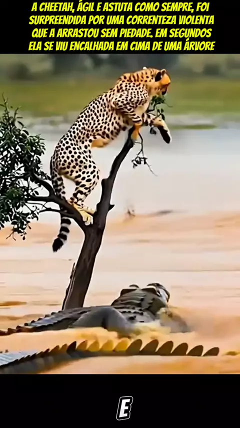 ssista até o final! 🐆💦 A cheetah, ágil e astuta como sempre, foi surpreendida por uma correnteza violenta que a arrastou sem piedade. Em segundos, ela se viu encalhada em cima de uma árvore, olhando para baixo com olhos cheios de tensão. Debaixo dela, a água fervilhava de crocodilos famintos, cada movimento de suas caudas aumentando o perigo. A felina respira fundo, suas patas agarrando firmemente os galhos, mas o medo aperta seu coração #educação #foryou #ia #viraliza #vidaanimal