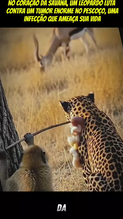 Uma cena inacreditável da natureza! No coração da savana, um leopardo luta contra um tumor enorme no pescoço, uma infecção que ameaça sua vida. O sofrimento é visível, e parece que não há saída. Mas, em um gesto inesperado, um macaco se aproxima. Com coragem, ele fura a infecção, e o leopardo solta um grito.... #educação #foryou #ia #viraliza #educação
