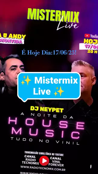 #MinhasMemóriasdeHojenoPassado 🎶 TERÇOU, GALERAAAA! 🎶 Hoje, às 20h, tem Mistermix Live com DJ Andy e o convidado especial, DJ Ney Pet! 🔥 É a NOITE DO VINIL! 🔥 Prepare-se pra uma viagem sonora com muito House Music e os Clássicos dos Anos 80 & 90! 💿 Tudo na matéria-prima! 🎧 Música de gente grande! 🕺💃 Nosso baile online de toda terça tá ON! 👉 Conto com sua presença no chat do YouTube! Bora fortalecer, bater papo e curtir muita música boa. 🎥 Assiste no link: https://www.youtube.com/