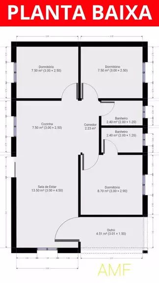 Planta baixa de casa com 3 quartos #casa #casas