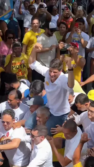 Bora pra frente, galera! Firme! TAMOJUNTO PELO RECIFE! 💛❤️ #PraTodoMundo João Campos chega na Convenção da Frente Popular sendo levado nos braços e rodeado pelas pessoas. Fim da descrição.