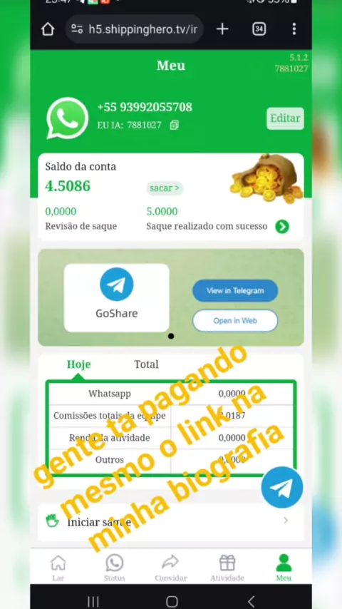 Ganhar dinheiro automaticamente no GoShare com WhatsApp e agora convido você a participar. Cadastre-se agora e tenha a chance de ganhar R$ 3000,00 por mês. http://new-server.shippinghero.tv/invite/7881027