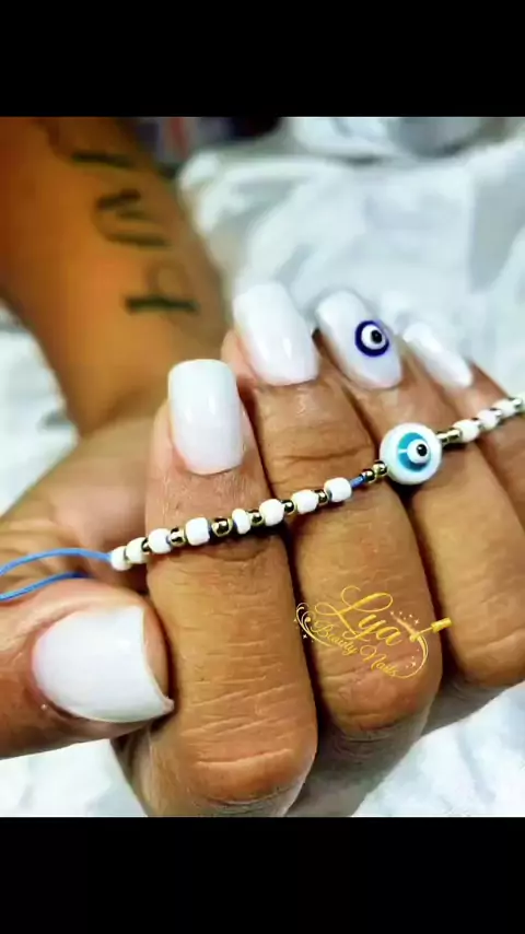 Refill over existing extensions. With milky white builder gel and a Turkish evil eye design. #nailsart #NailTutorial #nails #nailsinternacional #nailsinspo