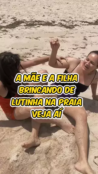 a mãe e a filha brincando de lutinha na praia Veja isso.